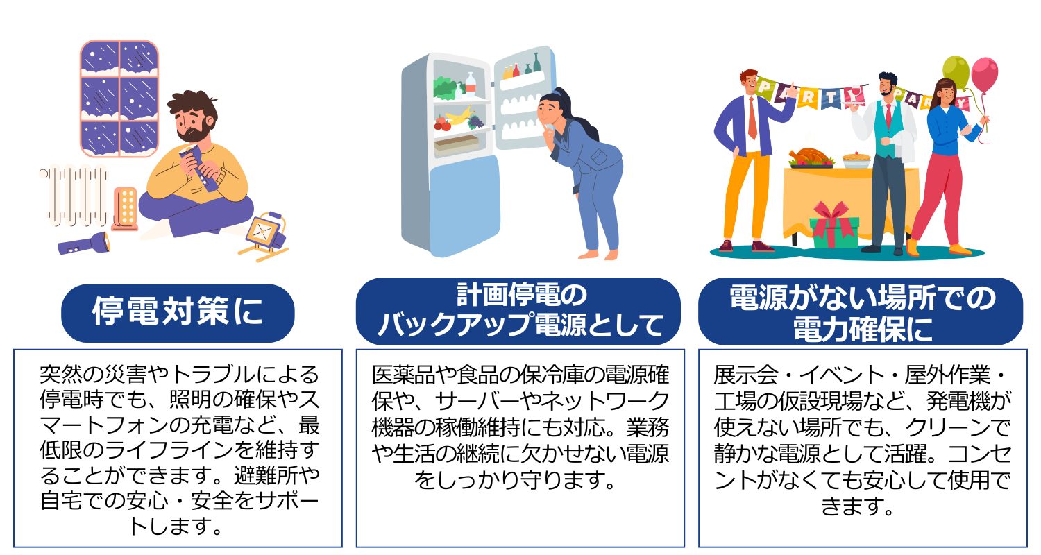 災害時の停電対策から、屋外イベントやBCP対策まで、どこでも使える電源として幅広く活躍します。