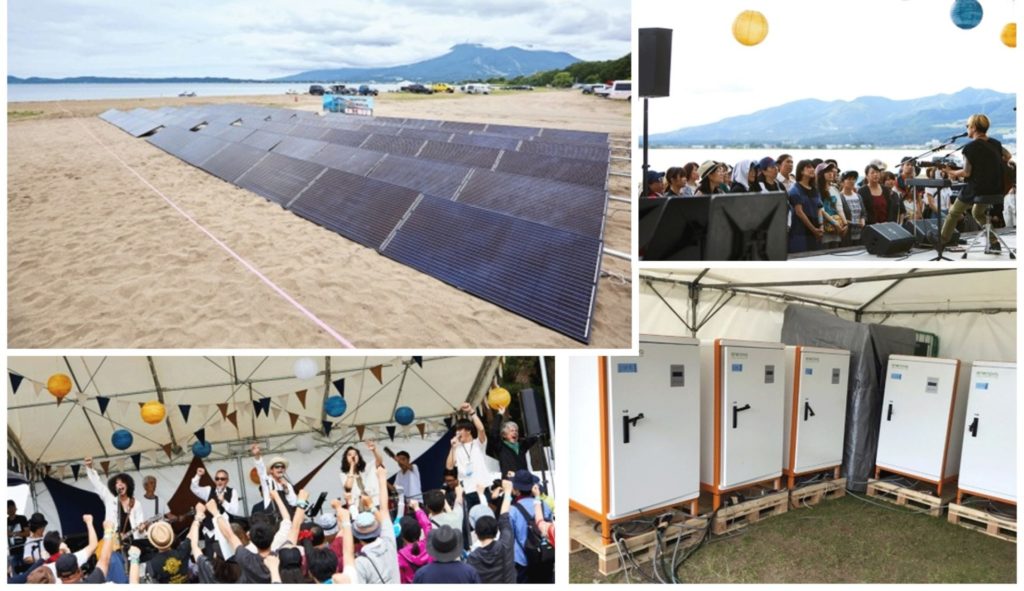 会場に太陽光パネルを設置し、発電した電力を蓄電池に充電し、蓄電池からステージへ電気を供給しました。